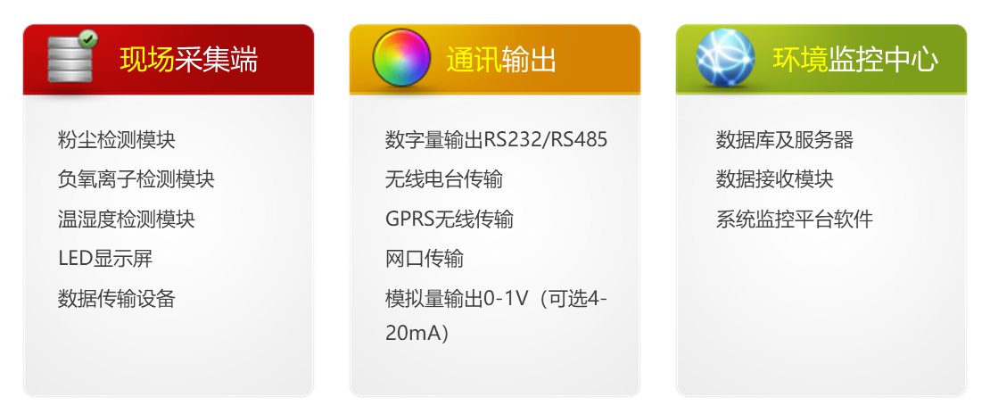 1、現(xiàn)場(chǎng)采集端:粉塵檢測(cè)模塊、負(fù)氧離子檢測(cè)模塊、溫濕度檢測(cè)模塊、LED顯示屏、數(shù)據(jù)傳輸設(shè)備